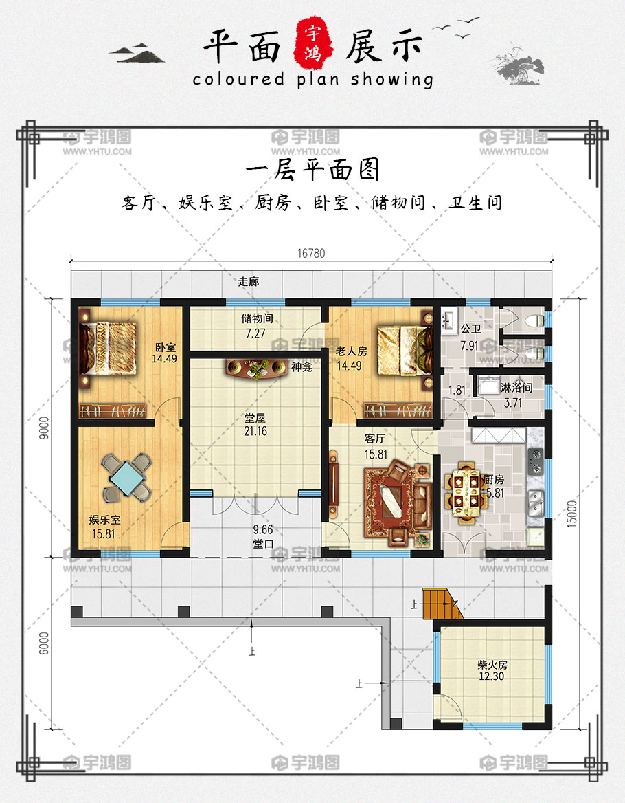 帶柴火房二層中式農(nóng)村房屋設(shè)計圖,設(shè)有堂屋和神龕。一層?xùn)|南角設(shè)有12.3平方米柴火房,從堂口前方進(jìn)入帶神龕的獨(dú)立堂屋,堂口右側(cè)連接客廳,老人房位于客廳上方,儲物間東側(cè)與老人房相連,又與北側(cè)走廊相連。堂屋左側(cè)有一個娛樂室和臥室。客廳右側(cè)有16平米廚房餐廳通間,還有淋浴間和公衛(wèi)。二層有3個臥室,一個客廳,一個書房,一個儲物間。外帶一個蓄水池,35.2平米大陽臺和16.6平方米露臺,此款是農(nóng)村人鐘愛的戶型設(shè)計圖。