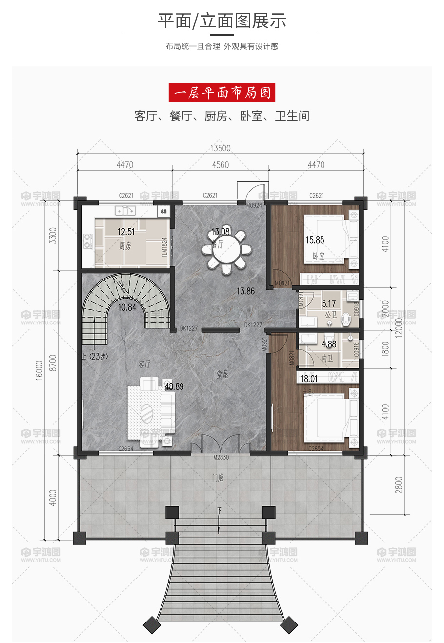 | 開間:13.5米 | 進深:12米 | 占地面積:215.7平方米 | 建筑面積:339平方米 |