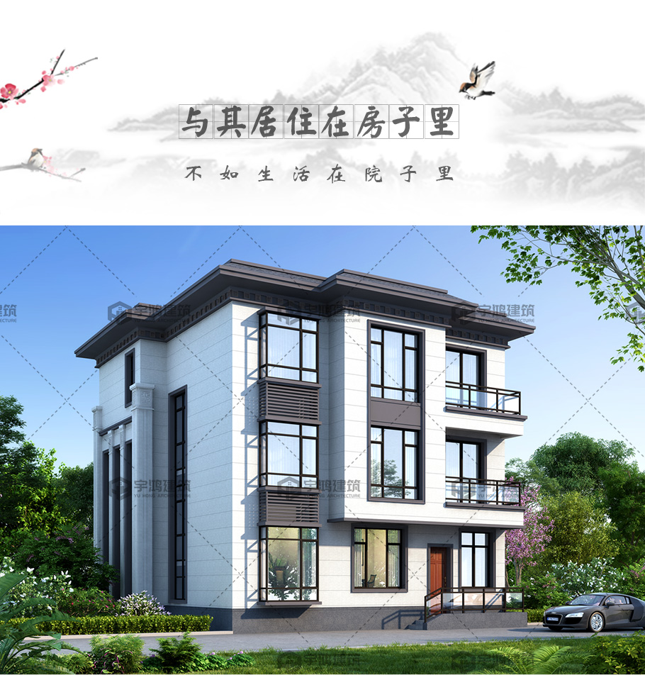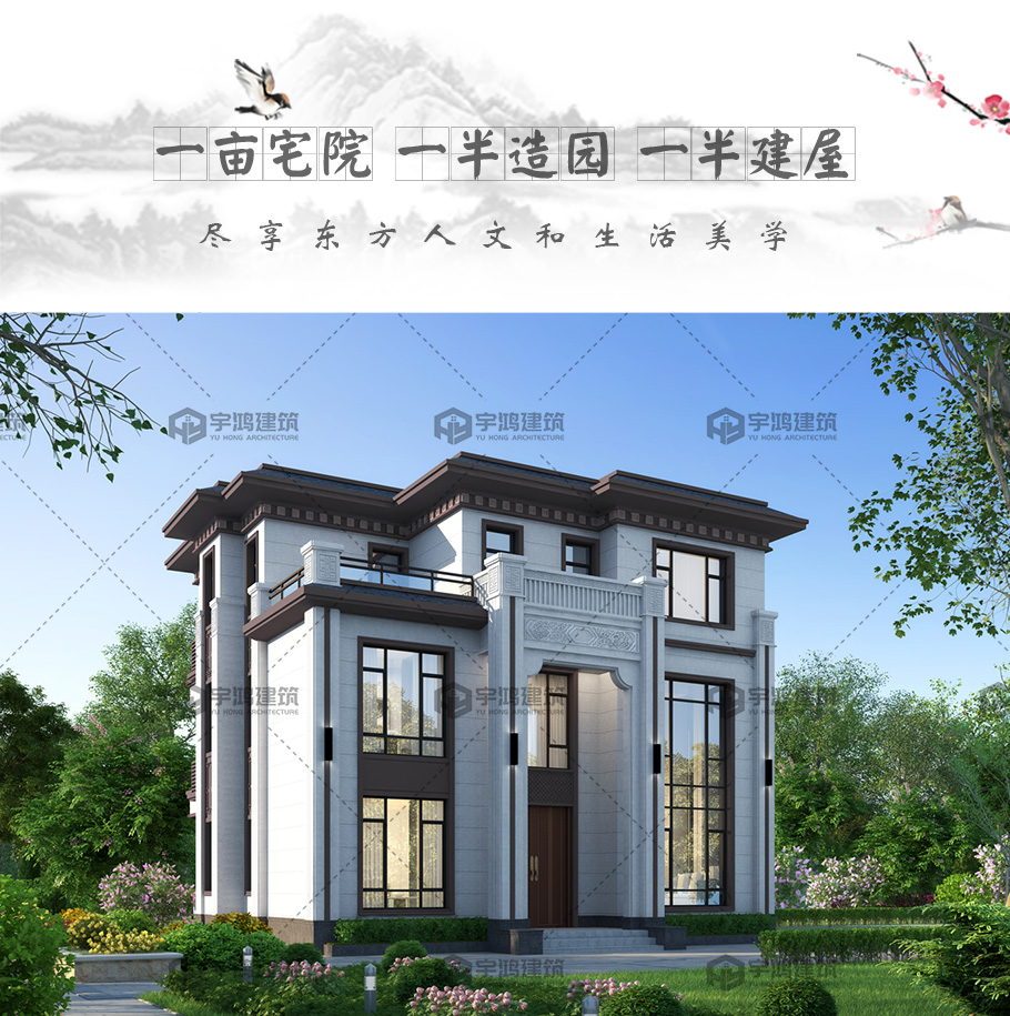 成品圖紙>三層框架新中式占地130平自建別墅設(shè)計圖