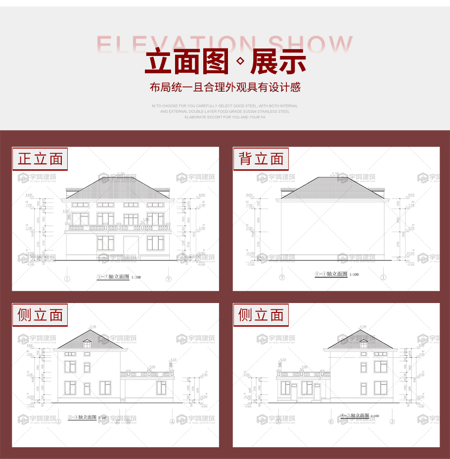 建筑平面圖:一層平面圖,二層平面圖; 建筑立面圖:東立面圖,西立面圖,南立面圖,北立面圖,剖面圖; 大樣圖:樓梯詳圖,細部大樣,門窗大樣 |