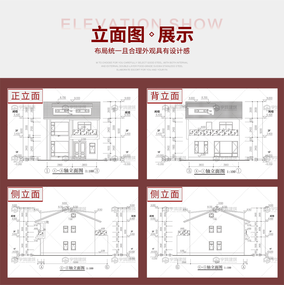 建筑平面圖:一層平面圖,二層平面圖,閣樓層平面圖; 建筑立面圖:東立面圖,西立面圖,南立面圖,北立面圖,剖面圖; 大樣圖:樓梯詳圖,細部大樣,門窗大樣 |